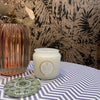 The candle is designed to sit perfectly in the depression of the coordinating glass lid when lit; and can be used to extinguish the flame when done with use. This stunning duo is packaged in a decorative box with metallic accents, perfect for gift giving.